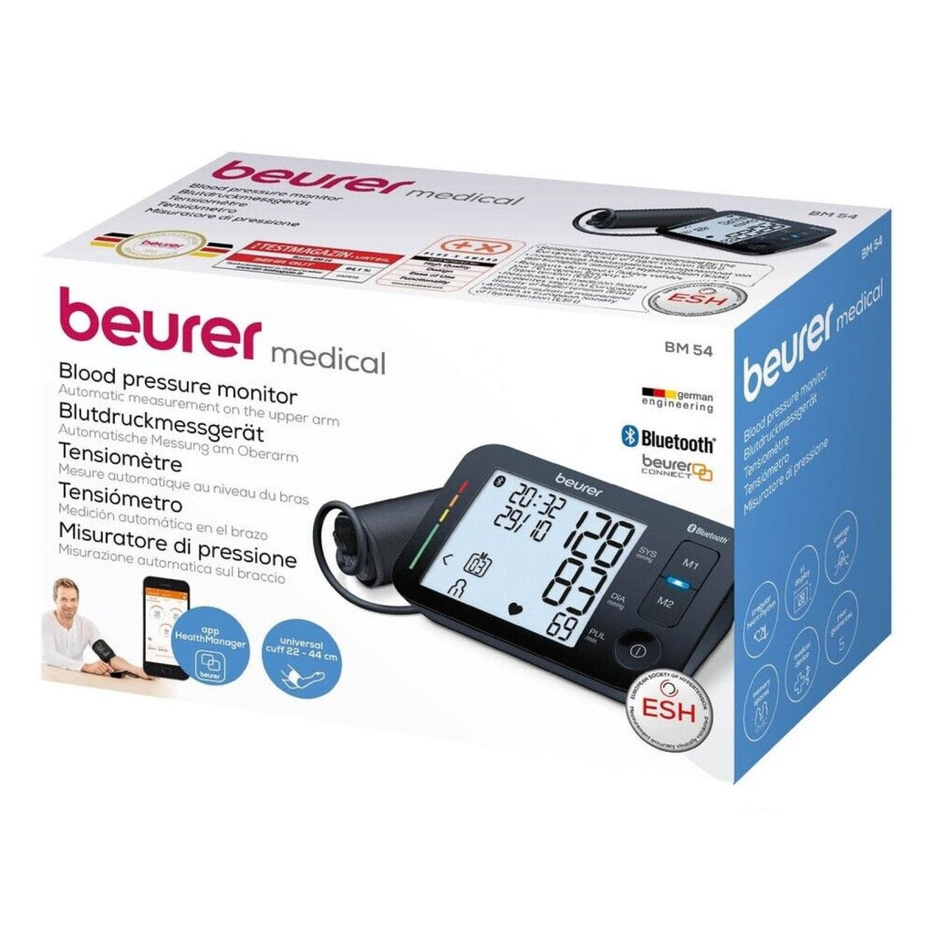 Beurer Germany BM 54 Upper Arm Blood Pressure Monitor with Bluetooth® connectivity and clear XL display. Designed for convenient, fully automatic blood pressure and pulse measurement at home. Wirelessly transfer readings to your smartphone using the Beurer HealthManager Pro app for effortless tracking and sharing with your healthcare professional. Built-in arrhythmia detection and risk classification help you interpret results quickly. Precision-focused for reliable everyday health monitoring.