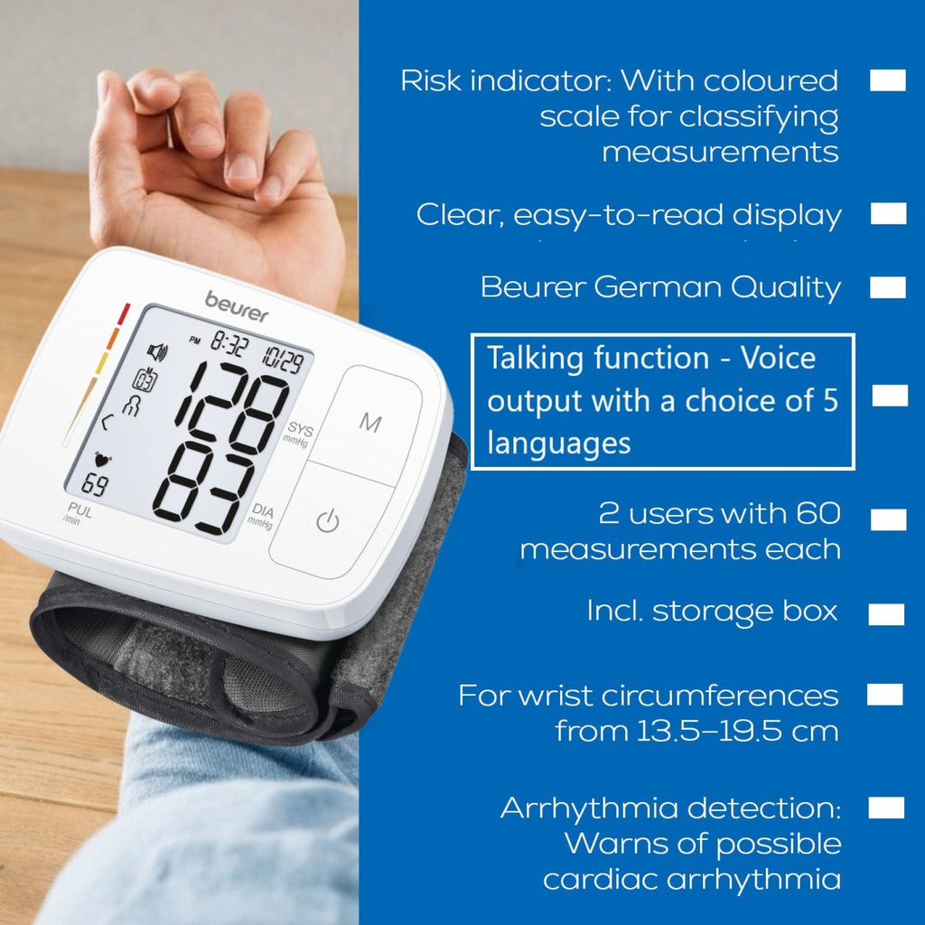 Model: BC 21 Talking Wrist Blood Pressure Monitor: Blood pressure monitor, wrist BP monitor, talking blood pressure machine, voice blood pressure monitor, BP machine, portable blood pressure device, arrhythmia detection, WHO risk indicator, Beurer BC21, digital blood pressure diary, hypertension monitor.