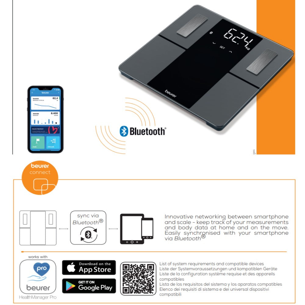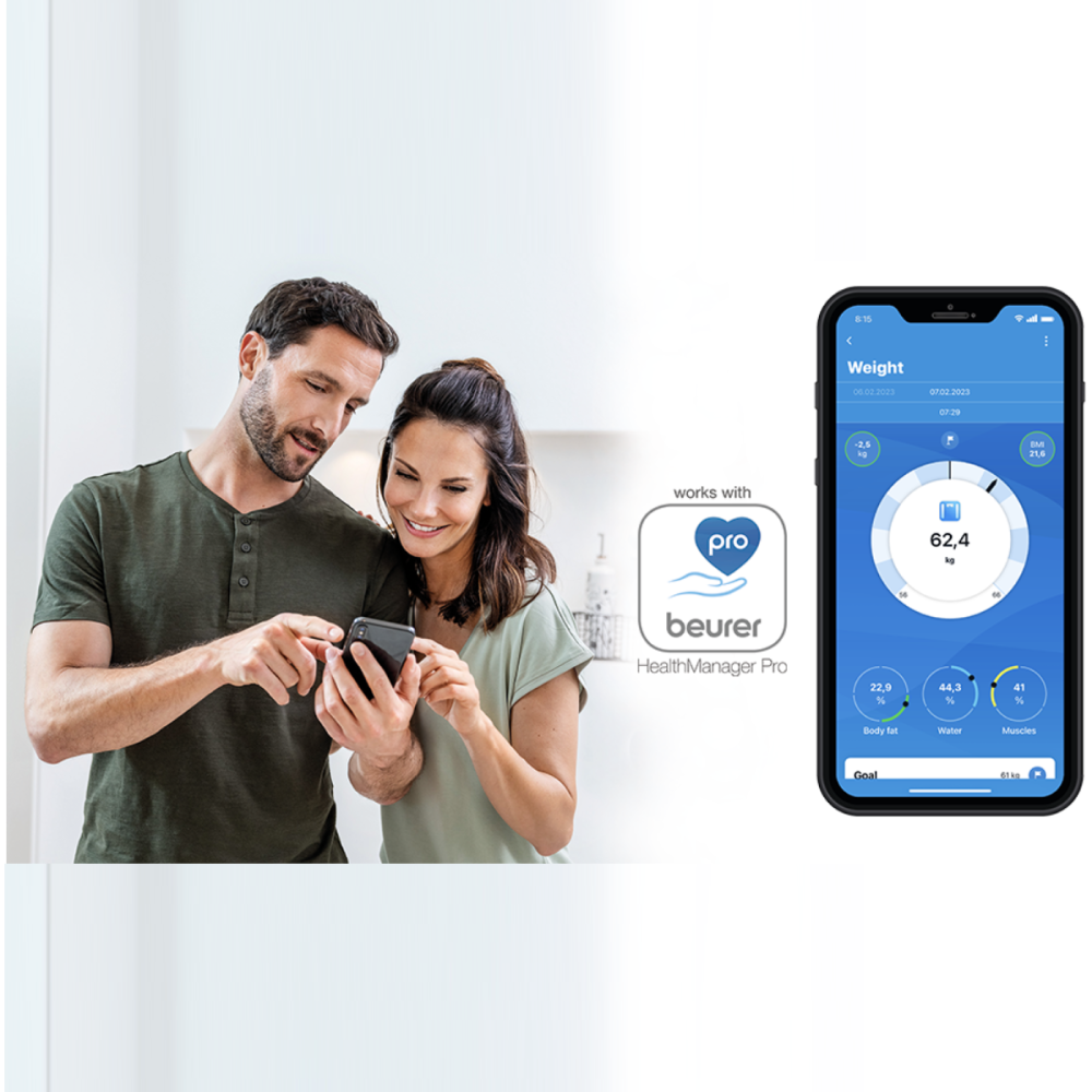 Keep Track: Download the free “beurer HealthManager Pro” app and experience innovative networking between smartphone and scale.