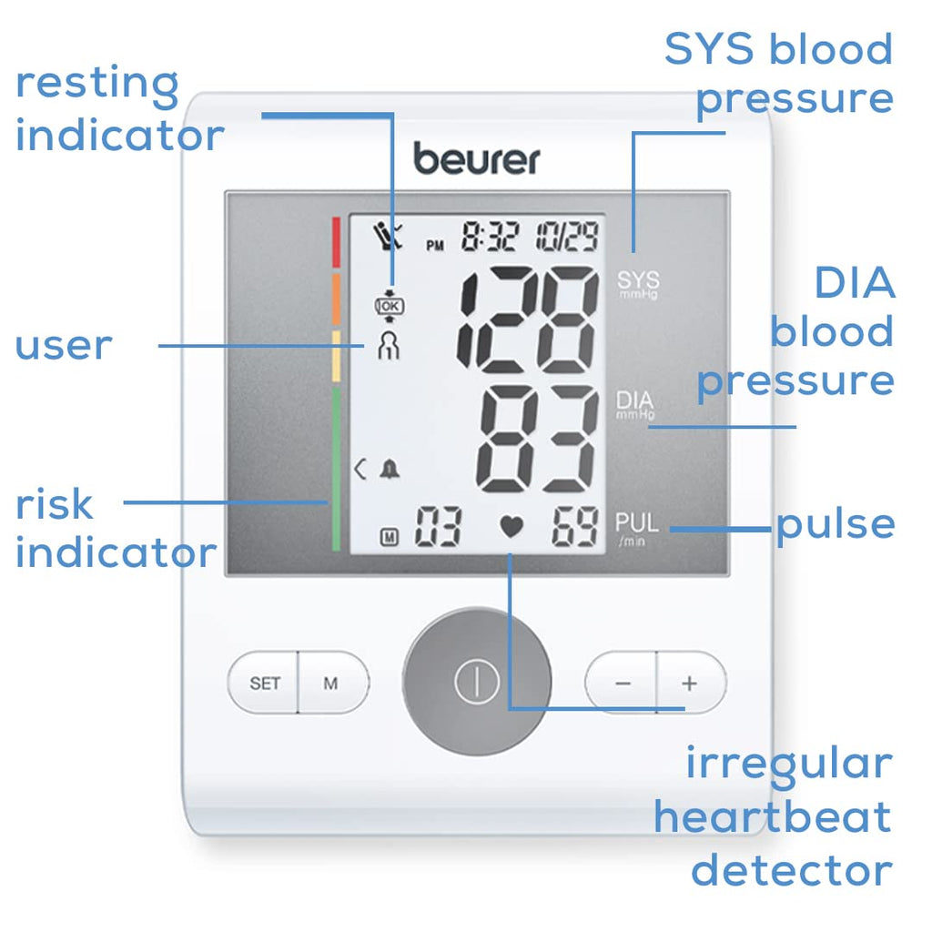 > Product: Beurer BM 28 ONPACK / BP Machine / BP Monitor / Blood Pressure Device with Mains Adaptor, Beurer BM 28 digital automatic upper arm blood pressure monitor. Blood pressure monitor with power cable, Accurate blood pressure monitor with arrhythmia detection, rest indicator, cuff fit control, alarm reminder, WHO risk indicator, averaging function, memory for multiple users. Easy-to-use BP monitor with LCD display. Blood pressure monitor with large cuff. Clinically validated BP monitor. BP monitor with HSD diagnostics. Medical device for tracking hypertension. Blood pressure monitor suitable for pregnant women.