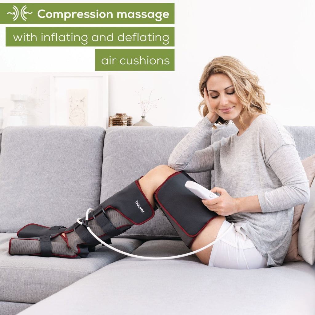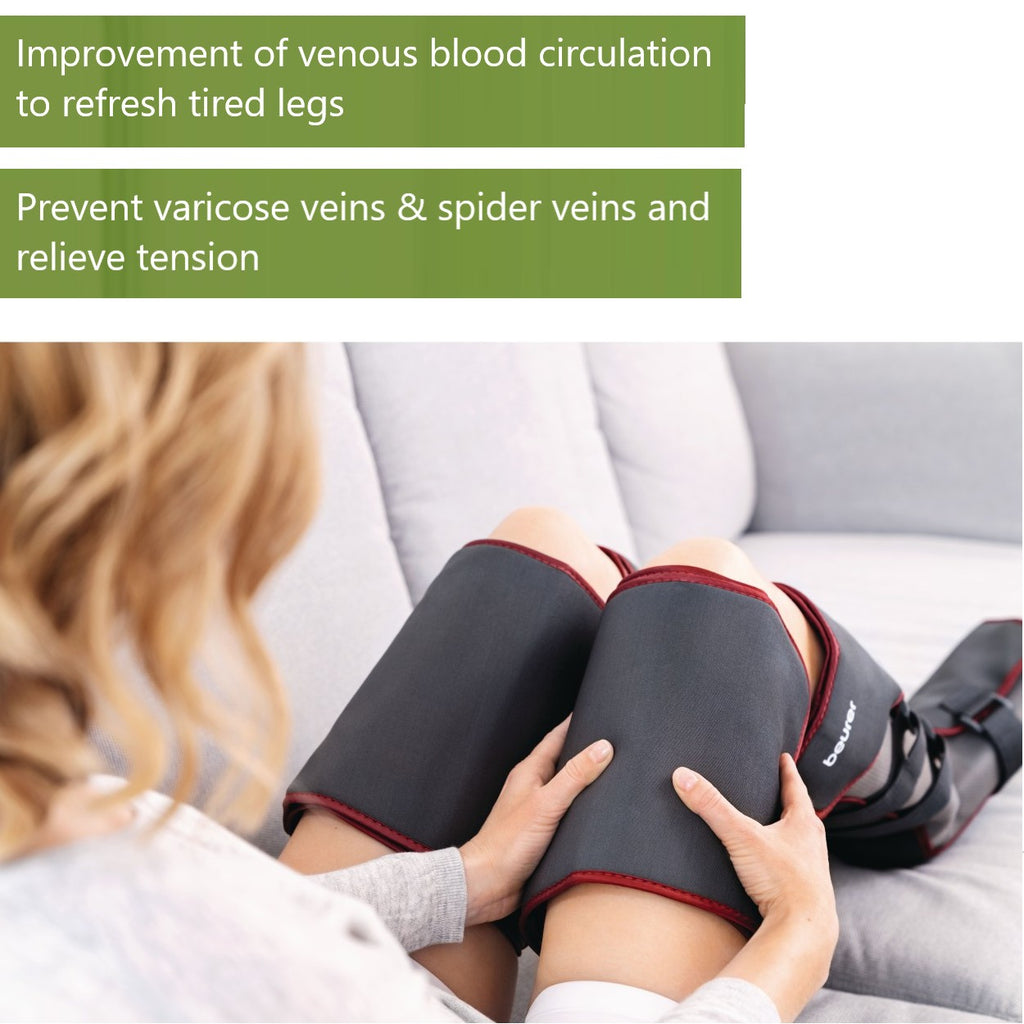 > Product: Beurer FM 150 PRO. Leg compression massager. Compression therapy machine. Leg circulation booster. Full leg massager. Air compression leg massager. Medical leg massager. Vein trainer device. Circulation massager for legs. Improve blood circulation in legs. Heavy legs relief. Varicose vein prevention device. Spider vein treatment home. Leg swelling reducer. Thigh and calf massager. Air pressure leg cuffs. Leg recovery massager. Sports recovery compression massager. Tired legs solution. Leg pain relief device. Poor circulation treatment. Leg swelling treatment. Relief for heavy legs. Post-sport recovery device. Compression therapy legs. Leg massager for blood flow improvement. Compression massager for varicose veins. Home device for leg swelling. Air compression therapy for tired legs