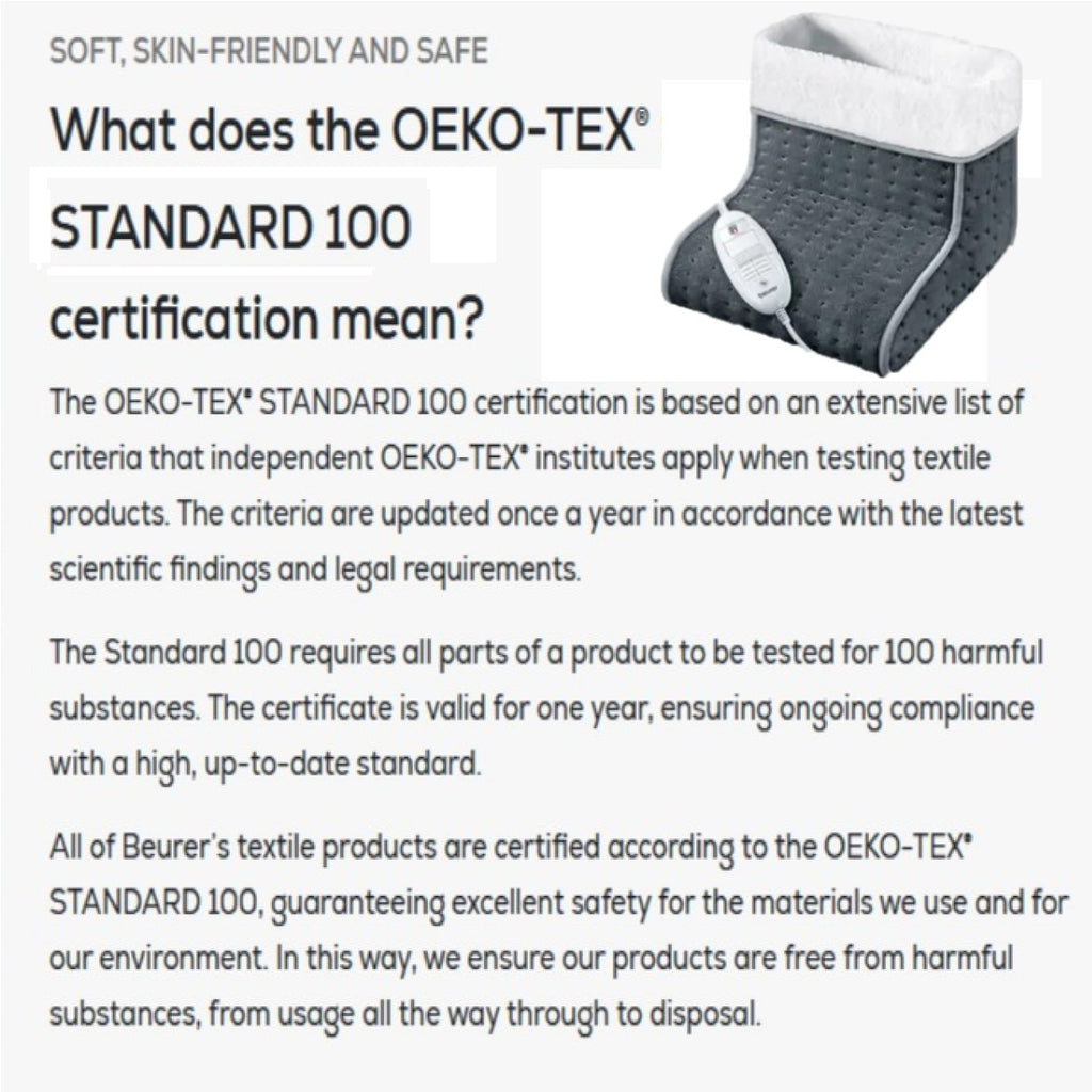 OEKO-TEX® Standard 100 Certified: The textiles used for this device meet the stringent human ecological requirements of OEKO-TEX STANDARD 100, as verified by Hohenstein Research Institute. This is a worldwide consistent, independent testing and certification system for raw, semi-finished, and finished textile products.
