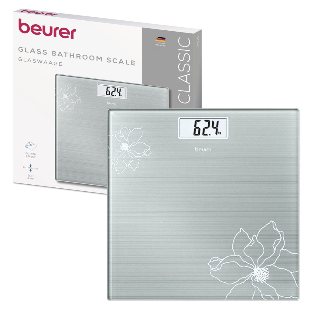 Beurer Germany GS 10 Bathroom Scale: Compact, Space-Saving. Silver-Grey Glass with Shimmer Flower Motif. 180kg Capacity