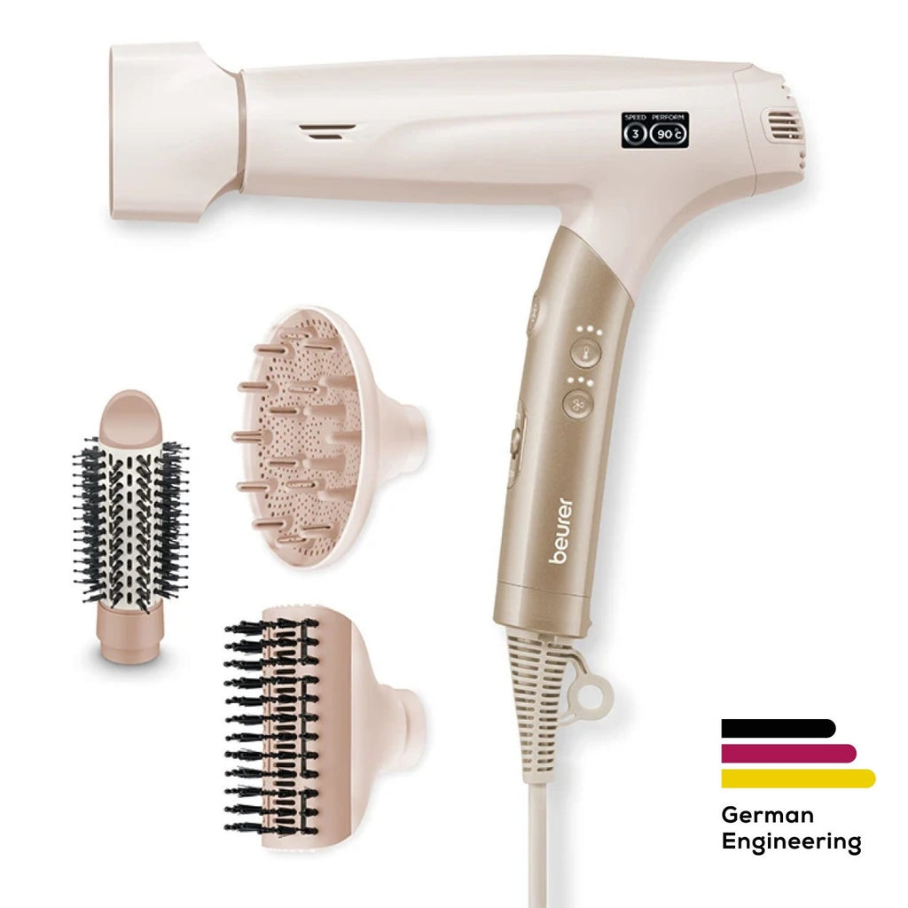 Product: Beurer HC 150 Fusion Dry Iconic Pro Hair Dryer, Ionic hair dryer, Digital motor hair dryer, High performance & lower power consumption hair dryer, Quiet hair dryer for home use, Travel friendly hair dryer with foldable handle, Professional hair dryer, Hair dryer with diffuser and brush, Lightweight hair dryer 1600W, Hair dryer for frizz-free styling, Salon-quality hair dryer at home, Compact hair dryer, LCD hair dryer with multiple settings, Hair dryer with ion function and cold shot