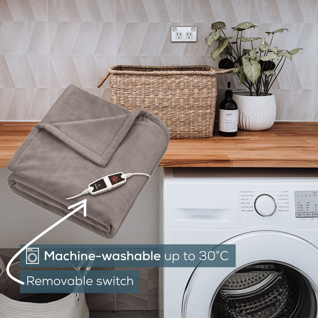> The heated blanket is machine washable up 30 degrees Celsius on an extra delicate cycle once the control has been removed. Please note that frequent washing has a negative effect on the product. The device could be washed in a washing machine once per season, if necessary, and a maximum of 5 times during its life. Immediately after washing, reshape to the original dimensions while wet and spread it out flat over a clothes horse to dry. Set the washing machine to a particularly gentle wash cycle (lowest spin rpm) at maximum 30 degrees Celsius (wool cycle). Use a delicate laundry detergent and measure it out according to the manufacturer's instructions.