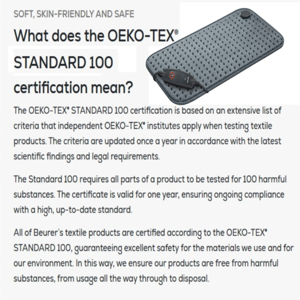 The cosy, soft fabric is warm and breathable. Your heated pad is made with textiles certified by the OEKO-TEX STANDARD 100. This standard guarantees that the material is skin-friendly and safe for you and the environment. The material used is tested annually against strict ecological standards to ensure that it is free from 100 harmful substances.