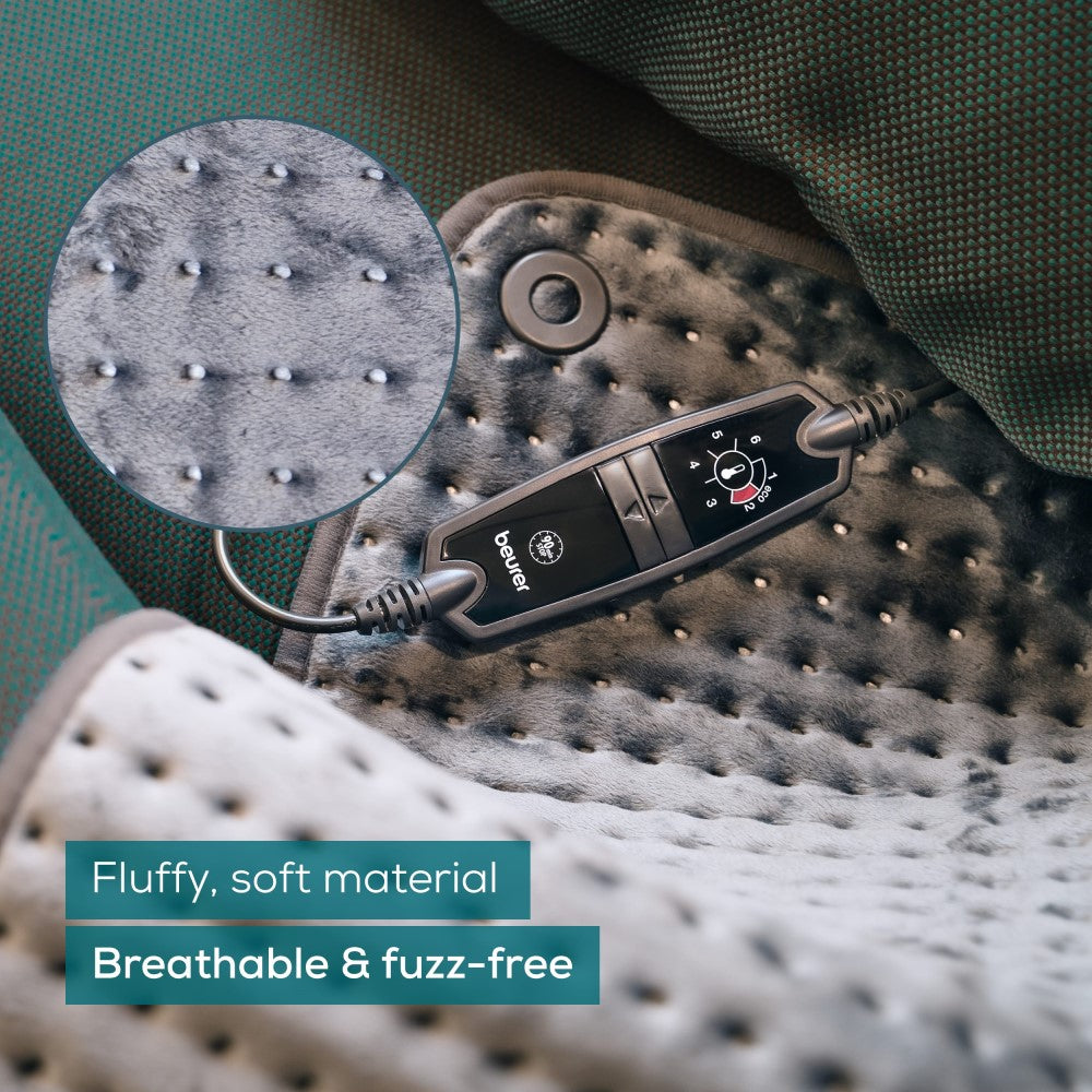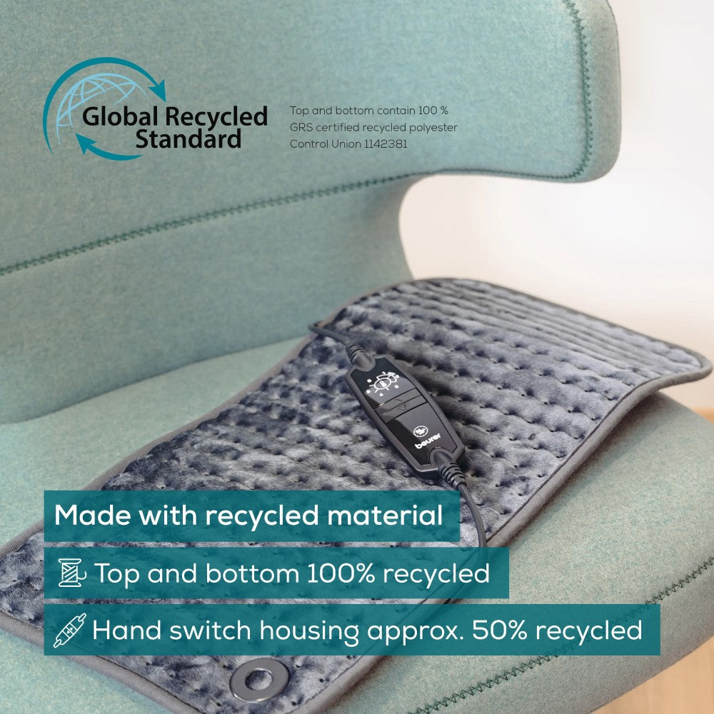 Product: Beurer HK 123 XXL GP, Beurer electric heat pad, electric heat pad, energy efficient electric heating pad, machine washable heated pad, electric heat pad with 6 heat settings, electric heat pad, soothe pain with warmth, heated pad, heating pad, XXL heat pad, eco-friendly, recycled materials.