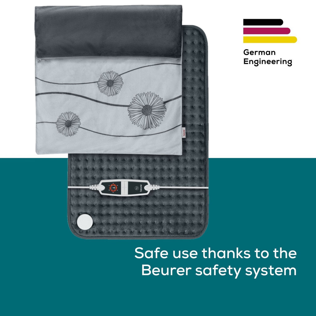 This device is equipped with an automatic switch-off function after approximately 90 minutes. It is possible to switch the device back on by sliding the temperature setting to 0 and waiting 5 seconds before switching the device on again. The heat pad is also equipped with the Beurer Safety System which ensures your safety with permanent automatic shut-off in case of malfunction. Enjoy warmth with peace of mind!