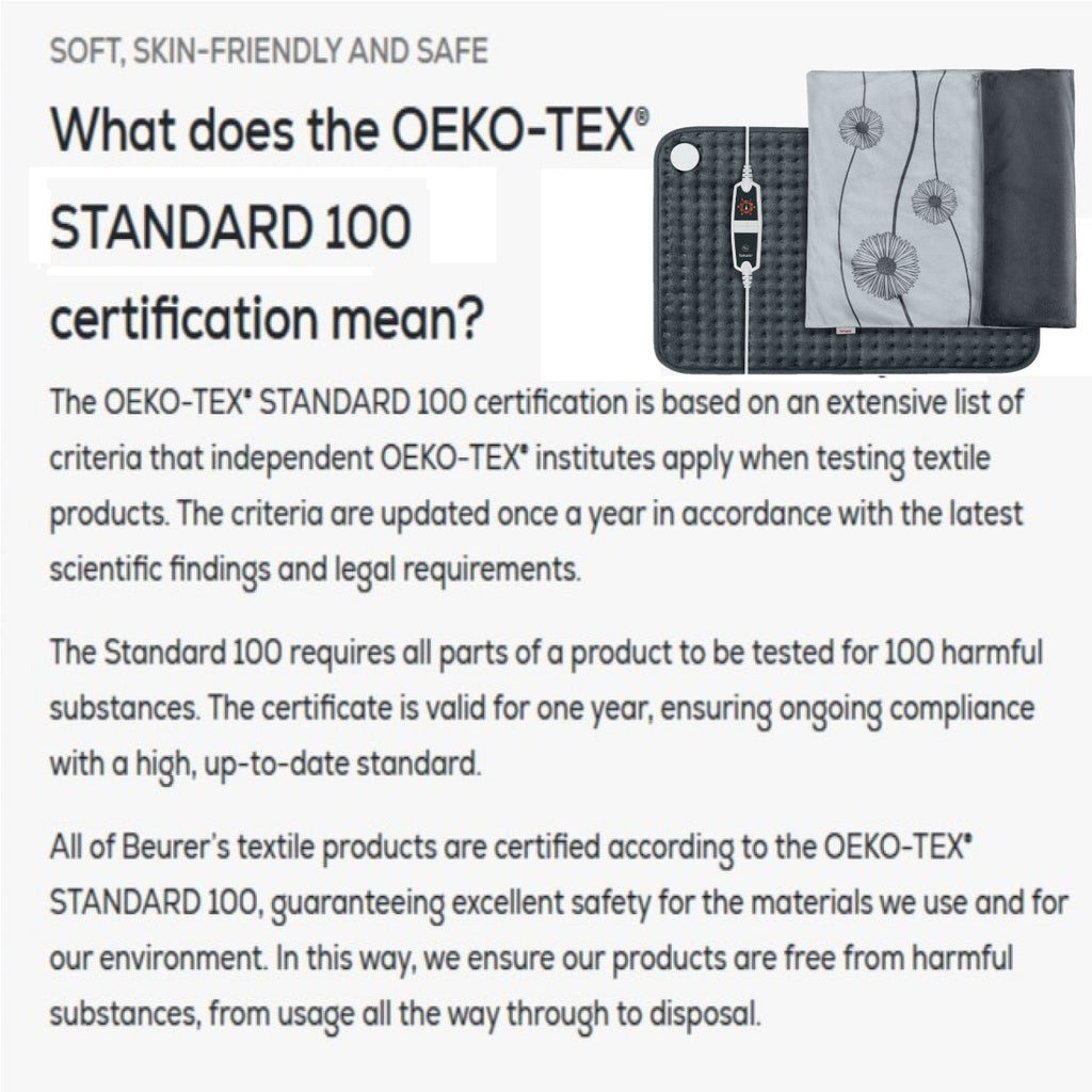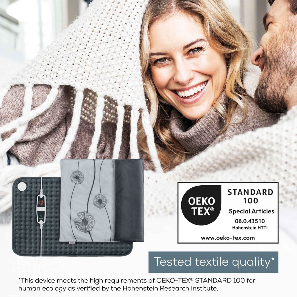The cosy, soft fabric is warm and breathable. Your heated pad is made with textiles certified by the OEKO-TEX STANDARD 100. This standard guarantees that the material is skin-friendly and safe for you and the environment. The material used is tested annually against strict ecological standards to ensure that it is free from 100 harmful substances.