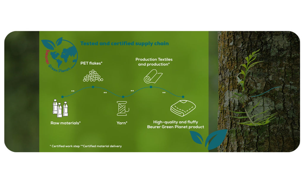 Global Recycled Standard: Experience cozy warmth while also doing something good for the environment. The top and bottom are made from 100% recycled material, without compromising on the usual soft Beurer quality. The switch housing is approximately 50% recycled, and the packaging is made from 100% recycled cardboard.