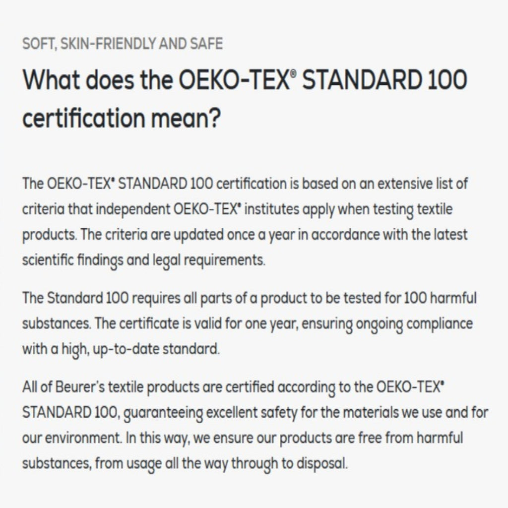What does the OEKO-TEX® STANDARD 100 certification mean? Your heated pad is skin-friendly and safe, made with textiles certified by the OEKO-TEX® STANDARD 100 through the Hohenstein Research Institute. This certification ensures the product is free from 100 harmful substances, meets strict ecological standards, and is tested annually based on the latest scientific and legal updates. All Beurer textile products carry this certification, guaranteeing safety for both users and the environment throughout the product’s life cycle.