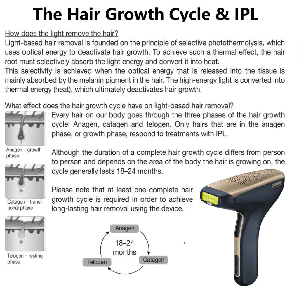 IPL treatment targets only hairs in the active growth phase (refer to the "hair growth cycle" image). As a result, multiple IPL treatments are needed to effectively deactivate all hair follicles. To achieve the best results, it's important to follow the recommended treatment schedule for both the body and face, as outlined in the MyIPL app. While the app provides a proven treatment plan, you can also create a personalized plan that can still yield satisfactory results with the Beurer myIPL device.