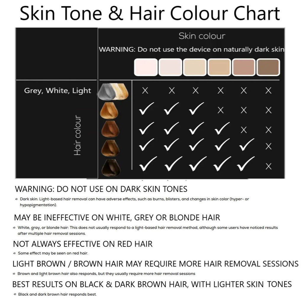 NB Do not use the device on naturally dark skin and particularly light, white, or grey hair (please refer to the skin tone colour chart in the images). May be ineffective on white, grey, blonde, or red hair. Follow the directions for use carefully.