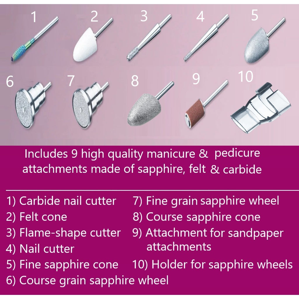 1) Manicure and Pedicure Device with 9 Attachments Suitable for Natural, Acrylic and Gel Nails