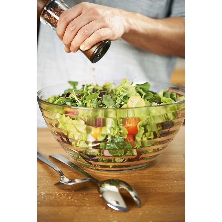 The perfect match for the bowl is the set of stainless steel salad servers.