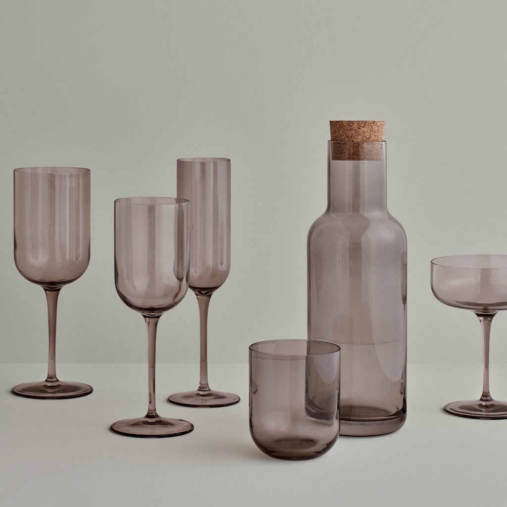 Complete your Fuum crystal sets with white wine glasses, red wine glasses, champagne flutes, champagne coupes, tumblers and a water carafe. Mix and match the beautiful colours for a striking ensemble. Available in 3 colours: Smoke (smoky grey hues), Nomad (golden-beige hues) and Fungi (brown-rose hues).